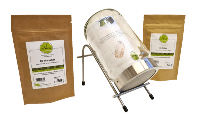 Das ist meine Wahl für Raygras, Veganen Dünger, Wildkräuter-Saatgut (z.B. Mariendistel für Mikrogrün, Brennnesselsamen, etc.), alle möglichen Getreidesorten für den Anbau von Gräsern (Hafer, Dinkel, Gerste, etc.) oder auch Buchweizen zum Keimen. Wunderschönes Keimequipment + meine Lieblingssprossengläser aus der Schweiz. (3,1l & 1,7l). Diese gibt es auch im preisgünstigeren Set (inkl. meinem Sprossit-Mix).